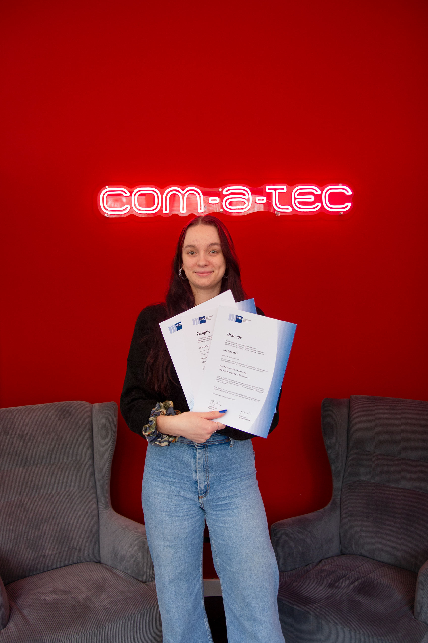 „Als duale Studentin bei der com-a-tec genieße ich den perfekten Mix aus Theorie und Praxis. Das Wissen aus dem Studium kann ich direkt im Arbeitsalltag anwenden und umgekehrt. Besonders schätze ich die vielfältigen Einblicke und das familiäre Arbeitsumfeld, in dem ich schon früh Verantwortung übernehmen und stetig wachsen kann.“